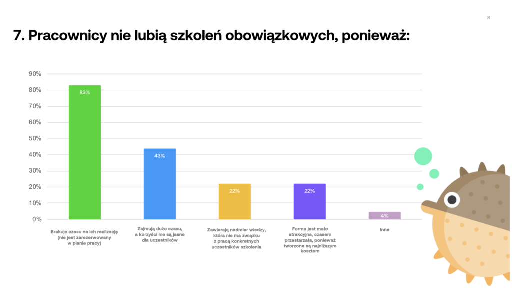 Organizacja odpowiedzialna za szkolenia obowiązkowe jest posłańcem, który niesie złe wieści. Przez to, że raportujemy brak ukończenia szkoleń okazuje się, że one są traktowane jak kara, a nie znamy wielu osób, które lubią kary.